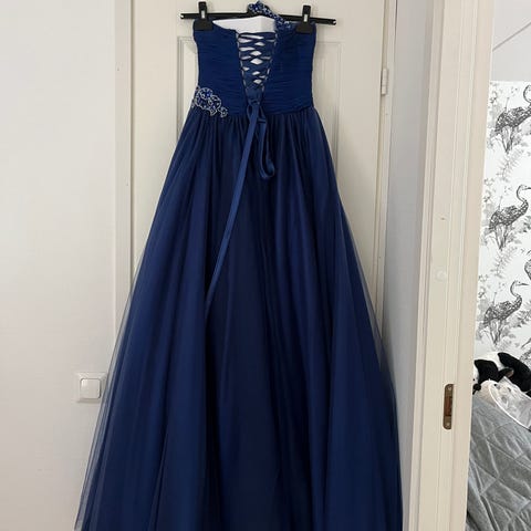 Myydään tummansininen vanhojentanssimekko. Kokoa S, sopii n. 165 cm pituiselle. Sovitus onnistuu.