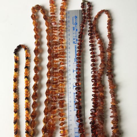 Näyttävät meripihkahelmet meripihkaisella kierrelukolla, pituus avattuna on 62 cm. Helmet suurenevat alaspäin ja suurimman helmen koko on 2,5x2 cm.