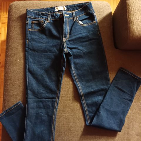 Vähän paksumpaa farkkukangasta, joustaa jonkin verran.