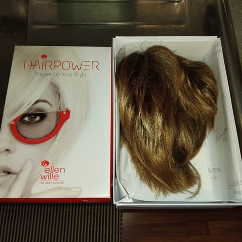Uusi kuituhius peruukki, käyttämätön, Hair Society, luxury class. Puolipitkä kastanjanruskea,koko L, alkuperäinen laatikko. Hoitoohjeet, hoitoaineet.