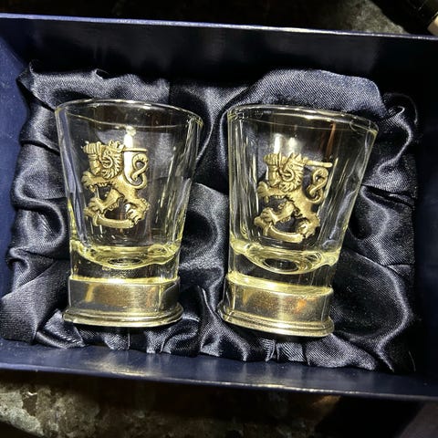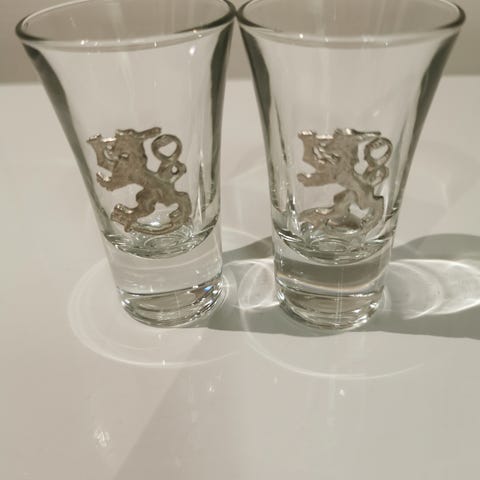 Snapsipikaripari Suomileijona tinalaatalla. Snapsilasit toimitetaan silkkivuoratussa lahjalaatikossa. Saatavana myös irrallaan tuotenumerolla A108.