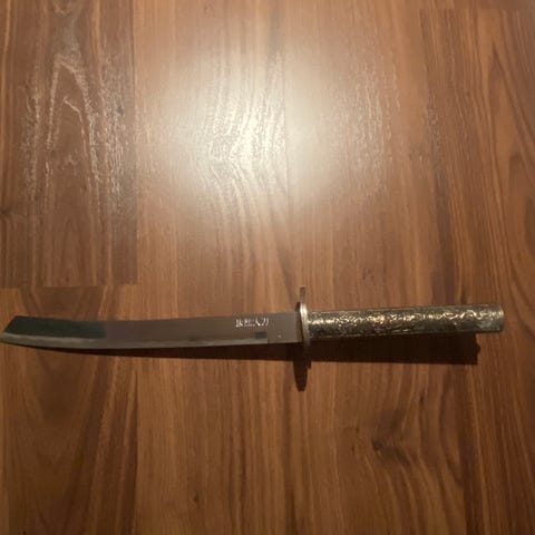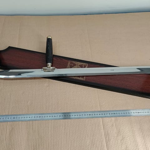 Upea koristeellinen miekka lohikäärmeaiheisella kuvioinnilla puisessa seinätelineessä. Toimitetaan lahjalaatikossa. Vain koristekäyttöön.