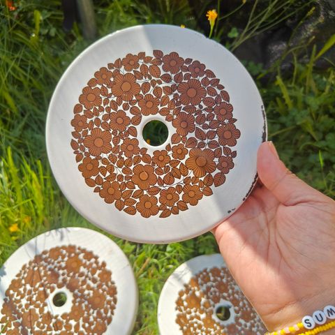 Kaksi ruskeaa hellanlevyn suojusta -80 luvulta.Emaloinnissa pieniä kauneusvirheitä.Halkaisijat 24 ja 16,5cm.