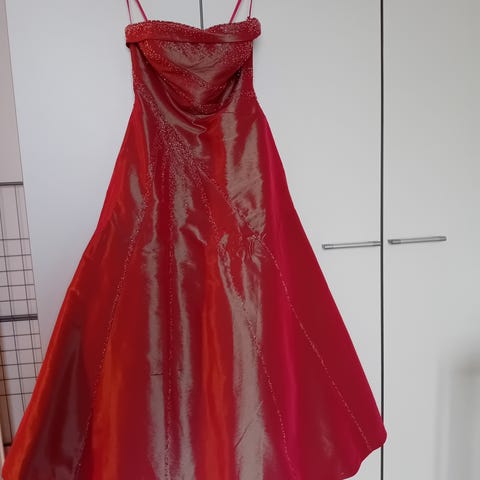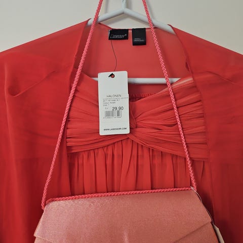 Ihana luumunvärinen puku , koko 38, helma kellomainen, kangas kauniisti kiiltelevä, pukuun kuuluu musta sifonkihuivi.