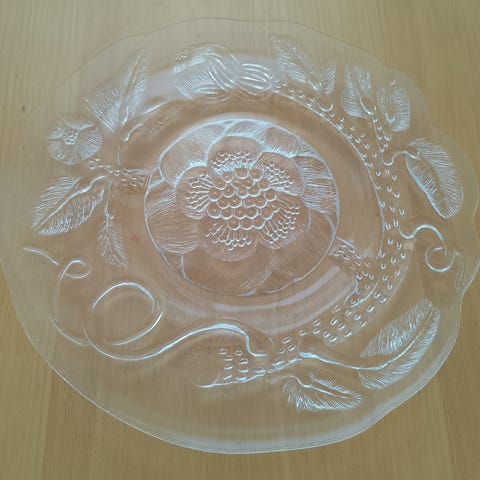 Käyttämätön ja paketissa oleva 30 cm oranssi Primavera tarjoilulautanen. Kuvio on Maija Isolan käsialaa vuodelta 1974.