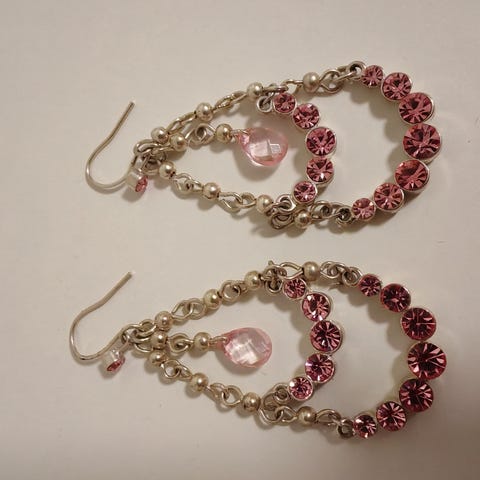Hopeanväriset korvakorut kevyttä materiaalia. Korkeus noin 10 cm ilman koukkuja. Koukuissa vähän tummentumaa.