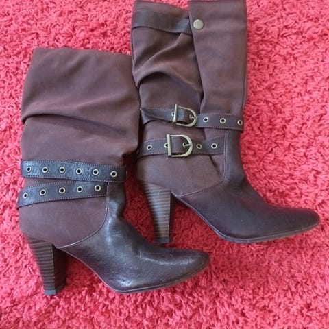 Takaa strechkangasta joka toisesta kengästä saumasta auennut n.2cm. Saa parsittua. Kengistä myös leikattu nahkainen hihna pois. Ns. Virheet näkyy kuvissa.