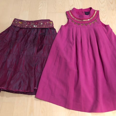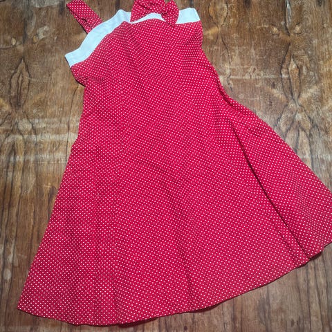 Tyttöjen vaaleanpunainen leninki valkoisilla pisteillä ja rusetti edessä