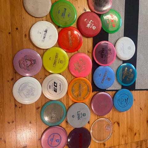 Hyviä frisbeegolf kiekkoja myyntiin ja myös hyvä bägi! Saa tarjota.