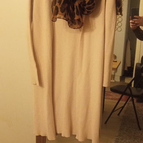 Kaunis beessinvärinen neuletakki, jossa valkoiset hihat. Beessinvärisen langan mukana kullanväristä hilelankaa. Hihoissa kullanvärisellä ja beessillä langalla kolme pystysuoraa neulosraitaa. Edessä molemmilla puolilla läpälliset paikkataskut napeilla. Myös kauluksessa on säämiskäkangastampit ja napit, jotka voi halutessaan poistaa. Hihansuut on kantattu säämiskäkankaalla. Edessä kokopitkä vetoketju. Kaulus ja helma resorineulosta Materiaali keinokuitua. Merkki Repeat.