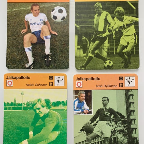 Vanhat tietokortit 1970 -luvulta suomalaisista jalkapallojoukkueista ja pelaajista: