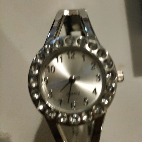 Kuin uusi metallinen rannekello. Linssissä vielä muovisuojus päällä. Mukaan metallirasia. Patteri pitää vaihtaa. Näytössä eQ logo