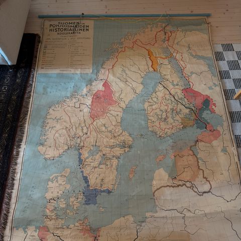 Myyntiin iso vanha koulukartta, itäinen pallonpuolisko. Mitat kartan valkoisesta yläreunasta alarimaan noin 170 x 265 cm. Yläpään metalliputken mitta 248,5 cm ja alarima 218 cm. Nouto Herttoniemestä.