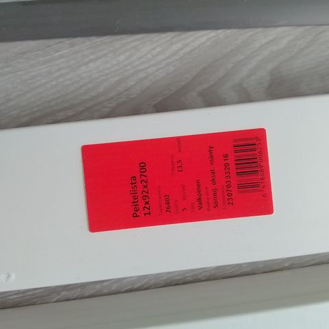 -Peitelista 12x57x3200mm. Valkoinen, mänty 5 kpl/pkt. Talouslaatu. 22.50€/pkt.