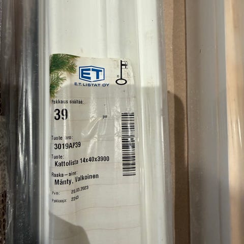 -Kattolista/Kourulista 30x30x3300mm oksaton mänty, valkoinen. Ykköslaatu 8€/kpl.