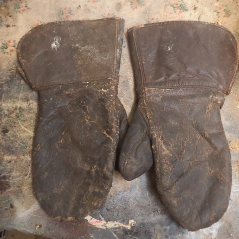 vintage, nahkarukkaset, nahkahanskat, molempien varressa ompelun tarvetta, samoin toisen peukalonpää kaipaa suutaria, näytösluontoisessa ajossa menevät ilman ompeluakin.
