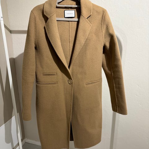 Andiatan tyylikäs harmaa pitkä villakangastakki. Vyötäröllä vyö.