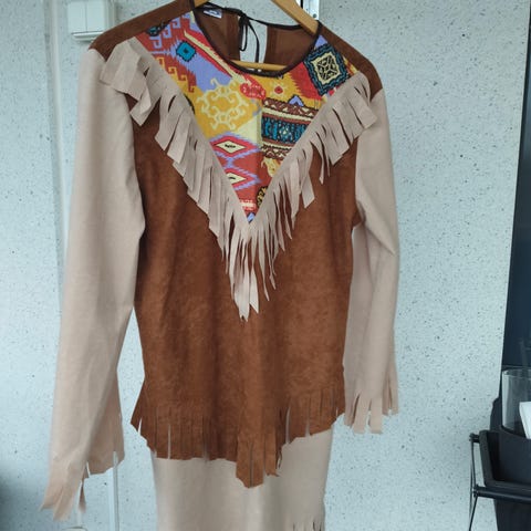 Myydään säämiskäjäljitelmällinen hapsullinen Pocahontas- tai intiaanipuku. Naisten koko S/M. Mukaan tulee vyö, jossa roikkuu pussukka sekä otsanauha.