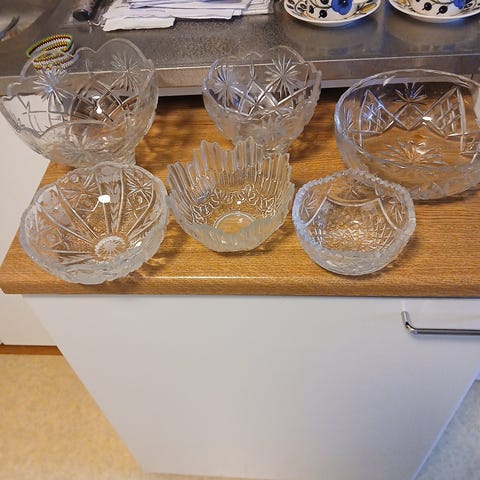 Halkaisija 21 cm. Korkeus 10 cm. Paino 1880 g . Sopii vaikka kastemaljakoksi.