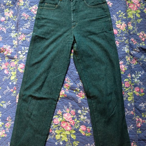 80-luvulta. Erinomaisessa kunnossa, ei mitään moitittavaa. Korkea vyötärö ja hieman kapenevat lahkeet. Lahkeensuissa hyvin toimivat vetoketjut. 100 % puuvillaa.