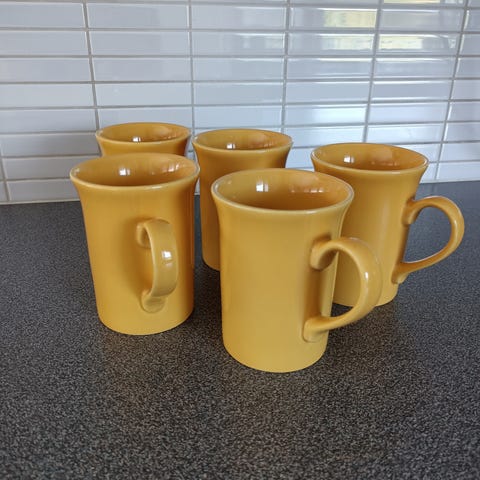 Vas.puol.Keltainen Kermansaven Muki, kork.8.3cm, suun halk.8.2cm 3 euroa.