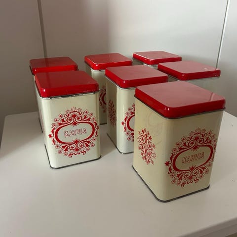 Ihastuttavat vanhat peltipurkit isoäidin jäämistöstä, settinä (5 kpl) yhteensä 25 €. Vähintään 80-luvulta, voivat olla vanhempiakin. Kunto yllättävän hyvä ikäisekseen, mutta purkkikohtaisia eroja sekä ulkoisesti että sisäpuolelta. Yhdessä on todennäköisesti säilytetty kyniä, joten sisäpohjassa enemmän naarmuja, kun taas toisessa sisäpuoli on niin hyvässä kunnossa että voisi melkein laittaa ruokaa säilöön. 4 purkissa ei näkyviä lommoja mutta ehkä kaikki hieman muotopuolia, ts. kansi joissakin vähän tiukempi. Yhdessä purkissa on näkyvästi kulma hieman ryttääntynyt, mutta siihen ei kiinnitä huomiota kun purkit ovat vierekkäin (ks. kuva). Pohjaväri on valkoinen, mutta joissain saattaa olla kellastumaa/värimuutosta kun tarkkaan katsoo. Kukkakuvio on purkin jokaisella sivulla. Eläintalous, nouto Riihimäeltä tai postit ostajalle. Maksu käteinen/MP. MMM