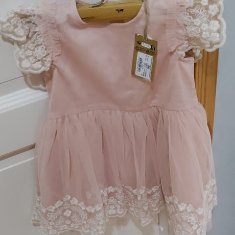 Valokuvauksessa käytetty hennon vaaleanpunainen Newbien pitsimekko. Kokomerkintä 92, 18-24 kk. Mielestäni koko on melko pientä, eli ikähaitari kuvaa käyttöaikaa paremmin. Toki malli mahdollistaa pidemmän käyttöajan. Kissakoti.