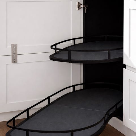 Kattilat ja muut tavarat helposti saatavilla myös kaapin takaosasta, tuo lisää toimivuutta kulmakaappiin.