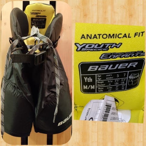 Lasten Bauer jääkiekko kerraston housut S. Ehjät, takana toisessa lahkeessa kulumaa ja edessä pieni.