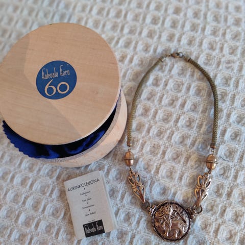 Hopeinen Aurinkoleijona kääty alkuperäisessä puisessa rasiassa, esite mukana. Erittäin hyväkuntoinen. Kaunis ja näyttävä koru. Ei valmisteta enää. Verkkoketjun pituus on 45 cm, leijonan halkaisija 25 mm. Käytetty aikoinaan vain pari kertaa.