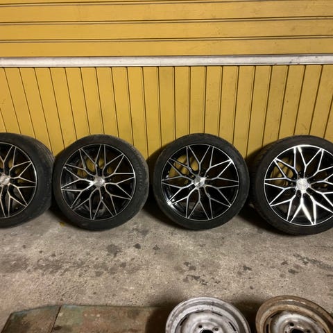 Forgestar F14 vannesarja. Päällä Pirellin kesärenkaat, takarenkaat käytännössä loppu, edessä vielä hieman pintaa. Yhdessä vanteessa jäljet, näkyy kuvissa. Muut vanteet virheettömät. Varmasti suorat.