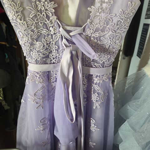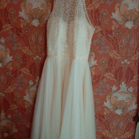 Olkaimeton, edessä strasseja, sifonkinen helma, takana nyörikiristys.
