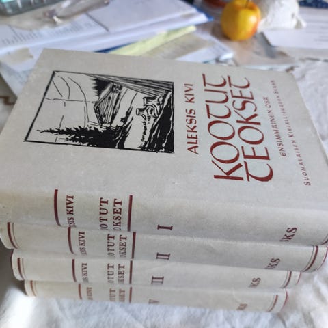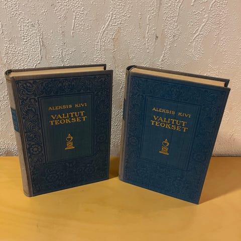 Aleksis Kiven kootut teokset, painovuosi 1925, SKS Suomalaisen Kirjallisuuden Seura. Nahkakantiset ja nahkaselkäset, sivujen yläreunat kullatut. Hyväkuntoinen sarja.