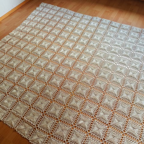 Käsin virkattu valkoinen päiväpeitto. Koko 190 x 220 cm.
