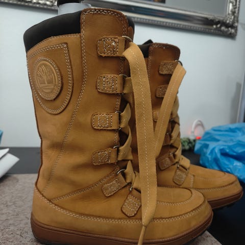 Myydään laadukkaat ja kauniit Timberlandin tummanruskeat nahkasaappaat, koko 37. Pinta ns. antiikkinahkaa, eli käsitelty patinoituneen näköiseksi ja pinnassa vahamainen suojakäsittely. Sisävuori napakkaa kangasta, ei muuta vuorausta, eli lämpimyydeltään viileän syys- ja kevätkelin saappaat. Varren sisäsivulla täyspitkä vetoketju ja ulkosivulla piiloon ommeltu joustinkuminauha, joka antaa hiukan joustoa leveyteen ja kävelyyn. Varren leveys yläreunasta n. 18 cm. Vähänkäytetyt ja todella hyväkuntoiset. Osoittautuivat käytössä itselleni kuitenkin kokoa liian pieneksi ja jääneet siksi kaappiin seisomaan.