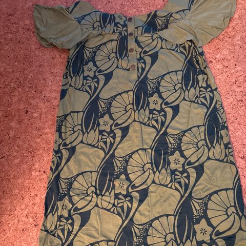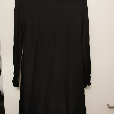 Nanso merkkinen kuosillinen musta tunika, koko L-D 44-46. Tunikassa on leveällä tereellä viimeistelty pyöreä pääntie ja täyspitkät hihat. Tunikassa on edessä leikkaussaumassa upotettuna taskut. Tunikan pituus on noin 80 cm, hihan pituus noin 63 cm, kainalot 54 cm.