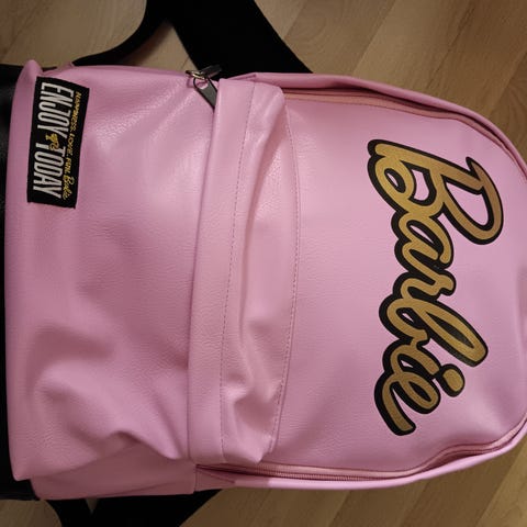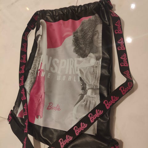 Käyttämätön liikkapussi / pikkureppu. Korkeus 30 cm. Barbie teksti ja heijastinnauha toisella puolella.
