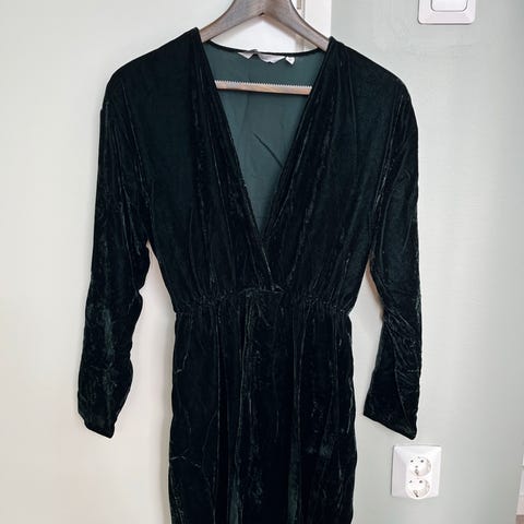 Kaunis kiiltävä sametti pintainen juhlamekko! Kerran käytetty. Pehmeän joustava materiali. Ovh. N.120eur. Avonainen kaulus. Tyylikäs. Koko 38 . Pikkujouluihin!