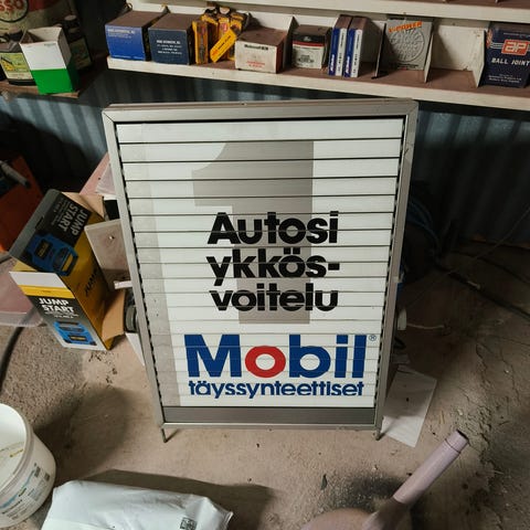 Mobil valomainos. Pituus 280 korkeus 75. Toimivuudesta ei tietoa kun johto leikattu poikki kun otettu seinältä. Ehjät muovit , vanha ja komea tallin seinällä. 0400619042. Juha