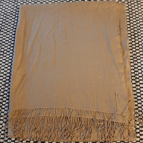 Suorakaiteen muotoinen ruskea huivi. Paisley kuvio.