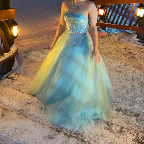 Mekko Zazabellan Dazzling mallistosta, ovh. 429€. Helmanpituus vyötärökoristeesta 110cm, olen itse 176cm ja tanssin 4cm koroilla. Selässä nauhakiristys jonka alla irrotettava suojakaistale, sifonkihelma. Pitsikoristeltu miehusta josta pitsiapplikoinnit valuvat kauniisti helmaan. Lähikuvissa väri todellisuutta kirkkaampi.