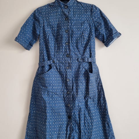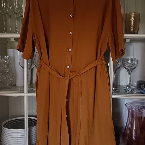 Tehty paksusta hiekkapestystä pellavakankaasta. Pehmeä, mukava päällä. Koko on iso, vaan vyöllä saa kurottua muotoon. Helma on V malliin ommeltu. Tähän uniikkiin takkimekkoon idea on fantasia maailmasta ja toteutus on omaa taidetta. Ainutlaatuinen tilaisuus.