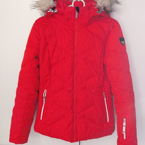Kauniin vaalean vihreä toppatakki (keinokuitua) ulkoiluun tai lasketteluun. Sisältää irrotettavan hupun, lumilukon vyötäröllä, kainaloissa vetoketjulliset tuuletusaukot sekä hihassa taskun hissilipulle. Merkki Boy-cot, koko 36.