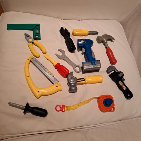 Erittäin tykätty työkalusetti seuraavalle touhuajalle! Kaikki toimii vaikka on tällä leikitty. Porakone toimii pattereilla, ne pitänee vaihtaa. Mukaan saa tietysti pakin. Ainoa moite on työkaluvyön pieni rispaantuminen, mutta senkin saa korjattua.