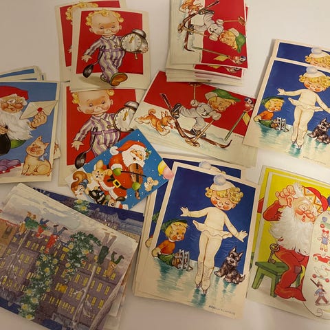42 tavallista ja 14 avattavaa joulupostikorttia sekä pieniä pakettikortteja ja -tarroja. Myydään pakettina.