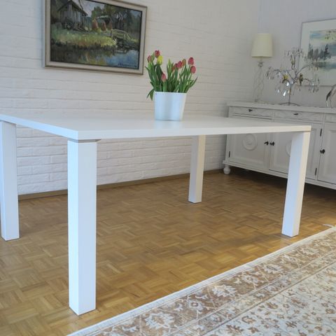 Knuut Design -pöytä, jossa massiivipuiset kansilevyt ja musta teräs/mänty runko. Pöydän mitat ovat noin 200 cm pituus ja 100 cm leveys. Sopii käytettäväksi ruokapöytänä tai työpöytänä. Pöytä on suunniteltu kestäväksi ja tarjoaa modernin teollisen ilmeen.