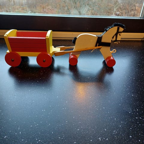 Vanha lelu 50-luvulta(?) olkitäytteillä. Satula ja kaviot muovia.