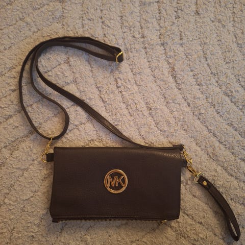 ruskea laukku, siisti, ehjä, nahkaa, säädettävä hihna, kaksi taskua sisällä