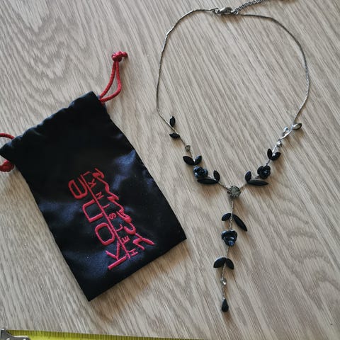 Myydään uudenveroinen musta Kone Helsinki Jeans -satiinipussi. Pussin saa vedettyä kiinni punaisilla nyöreillä.