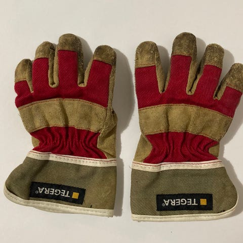 Työhanskat teddyvuorella, sormissa huopamainen vuori. Meillä olivat 4v käteen sopivat.